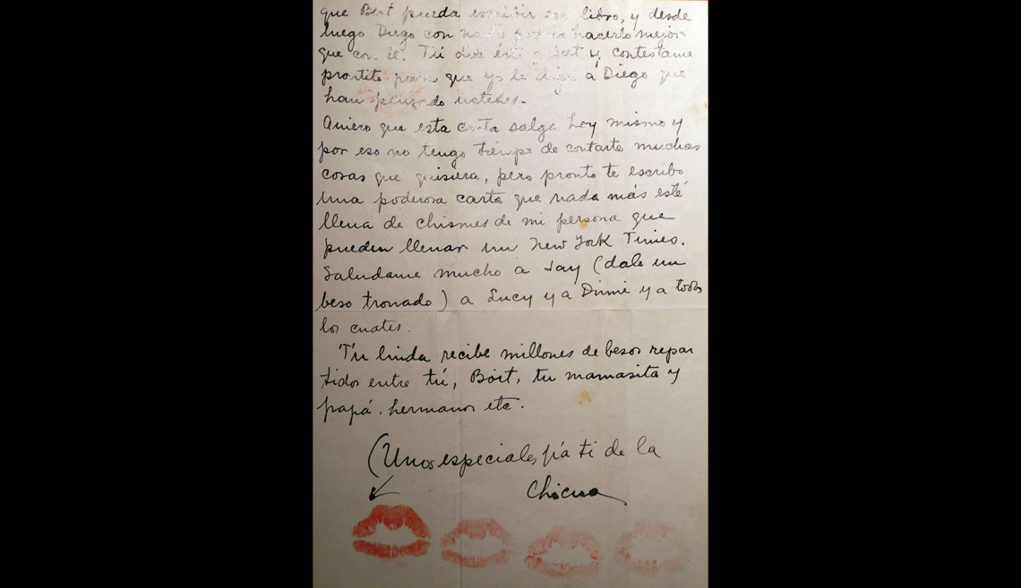 Letters to Ella and Bertram Wolfe; 1936; Bertram David Wolfe papers, Hoover Institution Archives. In the early 1920s, artists Frida Kahlo and Diego Rivera befriended Bertram and Ella Wolfe. Bertram was a scholar and founding member of the Communist Party of America but eventually changed his views and became an ideological adviser to the State Department’s International Broadcasting Office, which ran Radio Liberty and Radio Free Europe, as well as a senior fellow in Slavic studies at the Hoover Institution. Frida’s friendship with the Wolfes (particularly Ella) was strong, as evidenced by her affectionate letters. One letter is signed with her lips; another shows Frida drowning in a sea of tears.