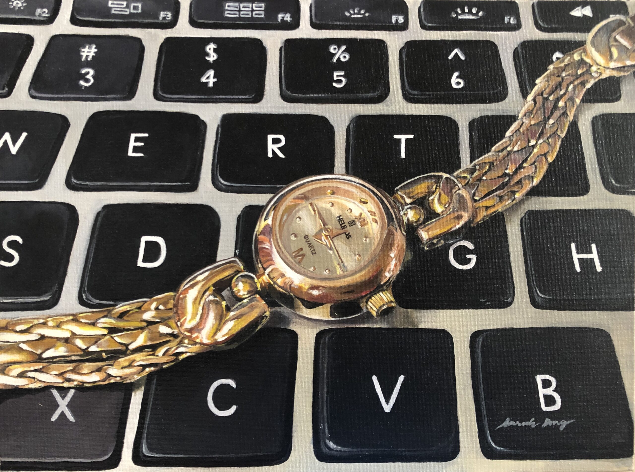 A wristwatch lies across a keyboard, the numbers juxtaposing the letters and a soft, glowing gleam reflecting across its surface.