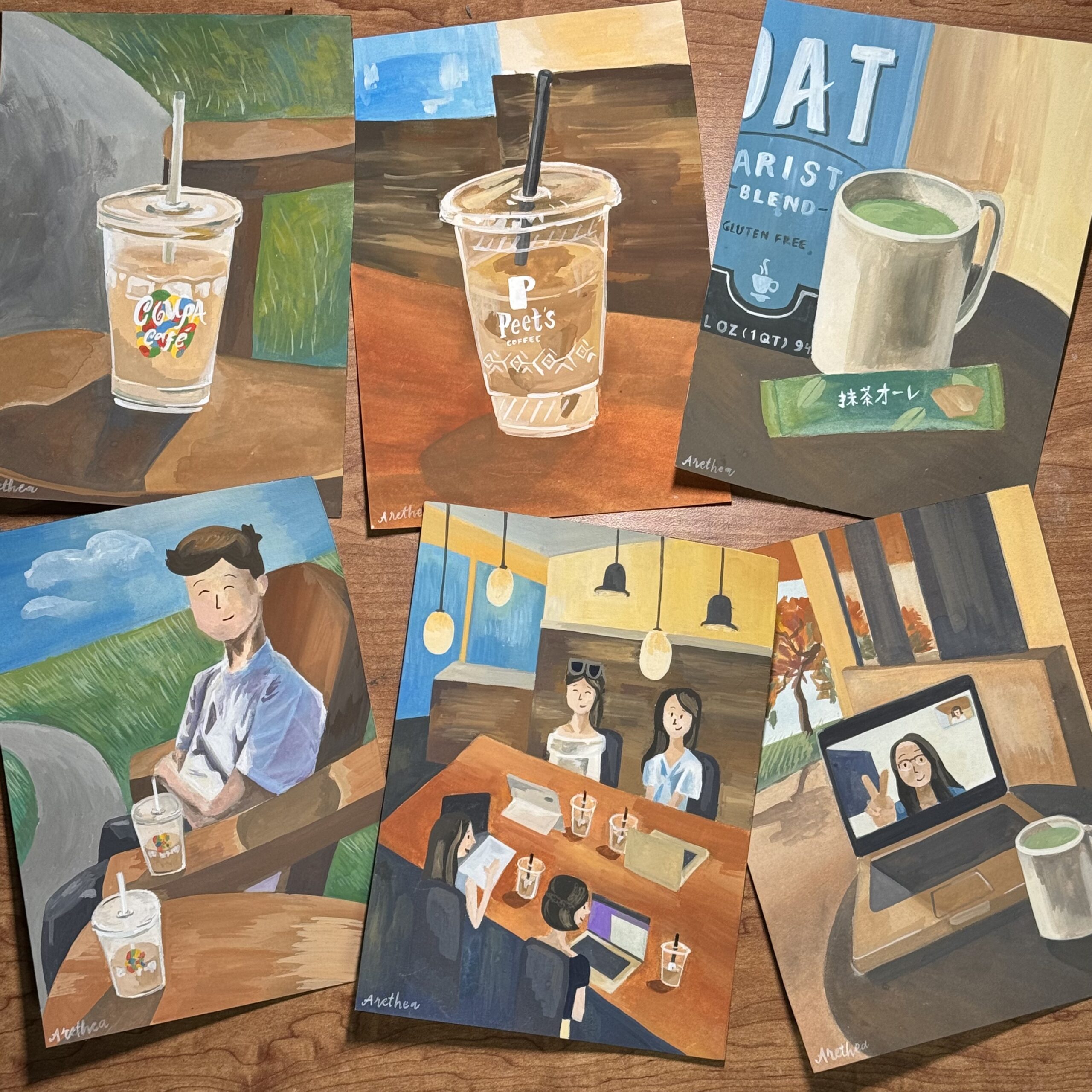 An ode to a few of many meaningful moments shared with friends over a cafe drink – Coffee at Peet’s, Chai by Meyer Green, and Matcha over Zoom.