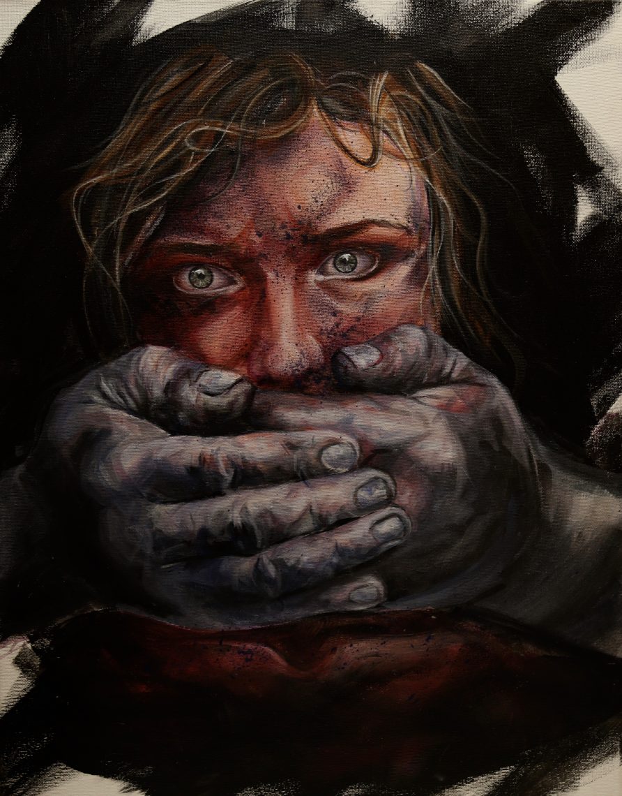 This is a painting for children with scars of violence and broken families. The blue hands are suffocating the girl’s strength to speak up.