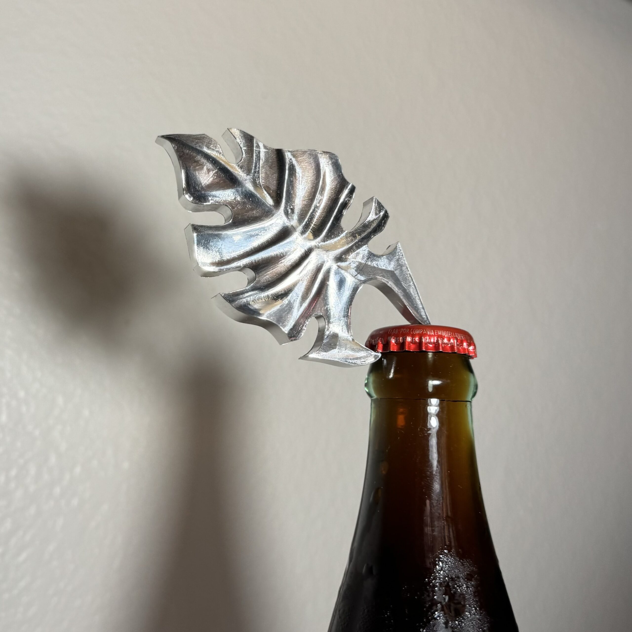 Aluminum CNC machined monstera leaf inspired bottle opener. I promise it looks better than it sounds.