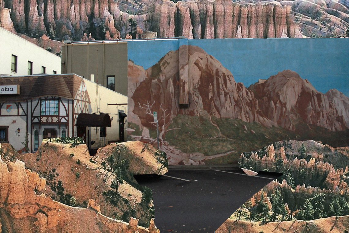This piece combines a photograph taken of a mural in Palo Alto with a vintage National Geographic photograph of the same location.