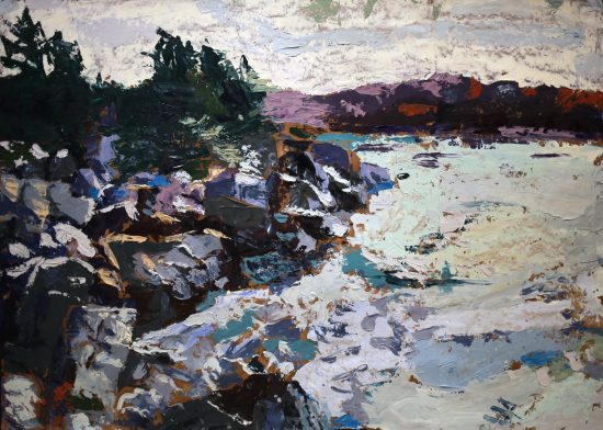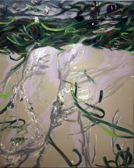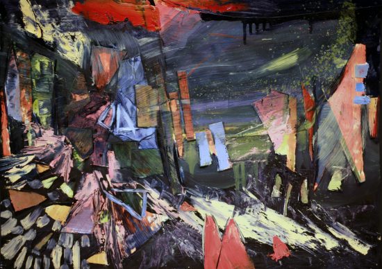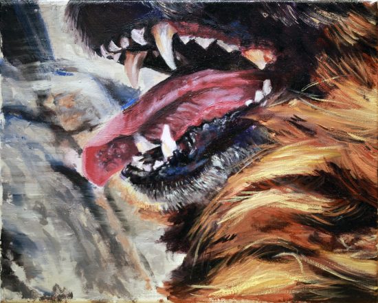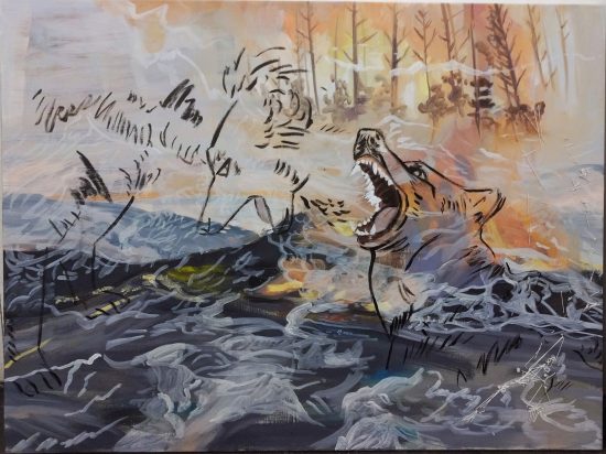 Lush layers of volanoes, forest fires, tsunamis are interwoven with snarling dogs, invoking chaotic and powerful forces of nature. 30″ x 40″.