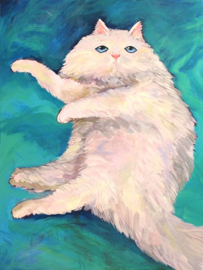 This painting is an interpretation of Magritte’s surrealist painting “The Mysteries of the Horizon,” replacing the men with an aging ballerina.