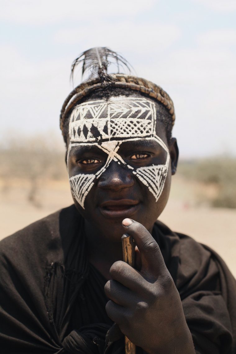 Taken on a Sophomore College trip to Tanzania, a Maasai junior warrior dons the traditional post-circumcision black robes and white face paint.