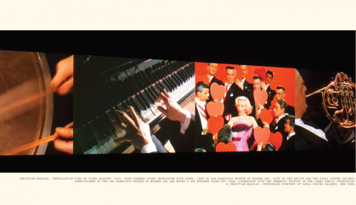 Marclay created “Video Quartet” on a home computer, using an off-the-shelf editing/composing program. He sampled more than 700 Hollywood, animated or other films—first scrolling through thousands—to collect footage of people singing, playing instruments, tap dancing, knocking on doors or somehow making noise. He then choreographed the snippets into an entirely new, flowing narrative. His governing impulse as an artist, he has said, is to take what people find familiar and create a new experience.