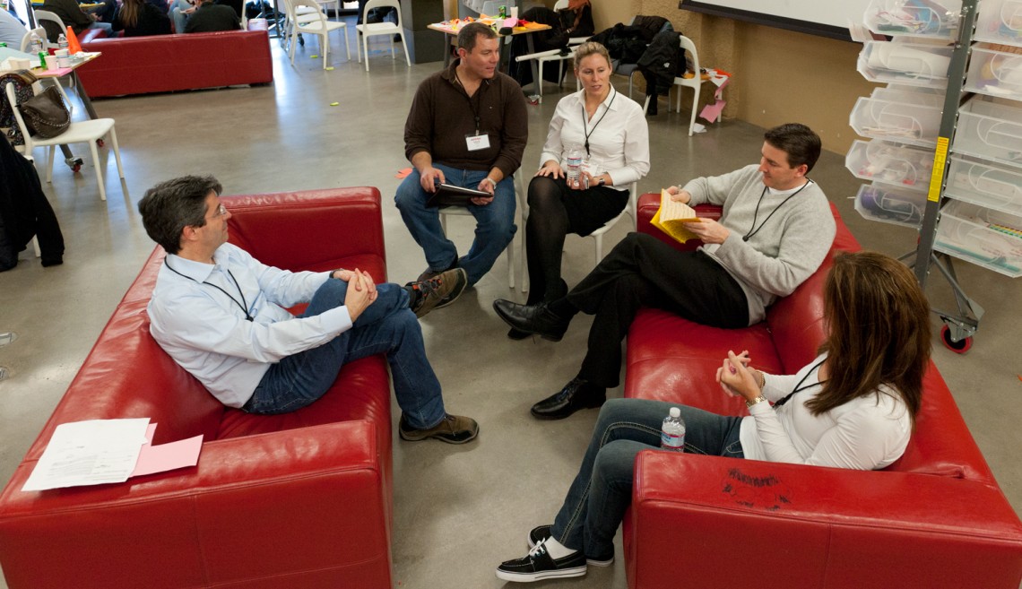 As a spectator on the second floor of Stanford’s d.school building, on any given day you might observe a team of students standing at a project table in an active stance – literally learning on their feet. Or you might see a group engaged in a sharing exercise sitting on foam cubes in a circle as if around a campfire. From the overlook you might also be able to peer down at the atrium and see an assembly of executives paired up at cocktail tables doing some cutting and pasting – as in scissors and glue, not keystrokes.