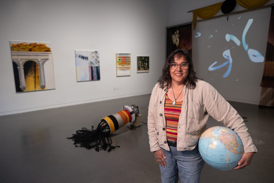 Holt Visiting Scholar, Kim Anno, poses for a portrait with her exhibit in the Coulter Gallery at the McMurtry Building at Stanford University on Monday, Oct. 24, 2022, in Stanford, Calif. (Photo by Jim Gensheimer)