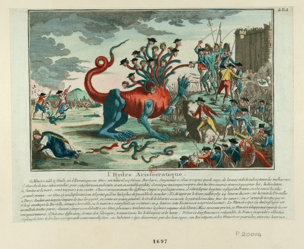 Vivid in color and in meaning, the images include stately portraits, depictions of what became a bloody symbol of the French Revolution – the guillotine – and satirical drawings like an aristocratic hydra monster mounting an attack on the people and French Guard.