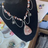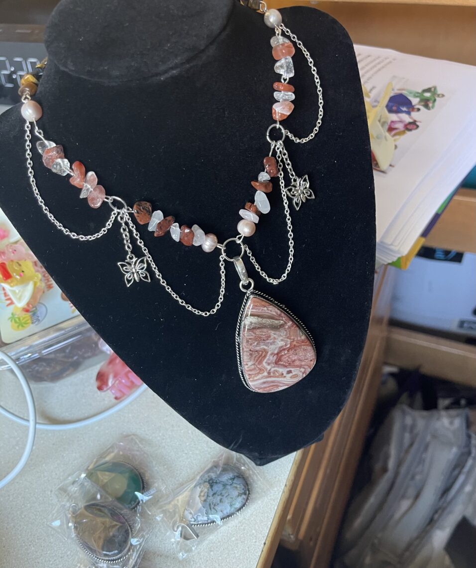 • A work in progress with a silver necklace in the process of being recycled. Pliers and wires lie around the desk workspace.