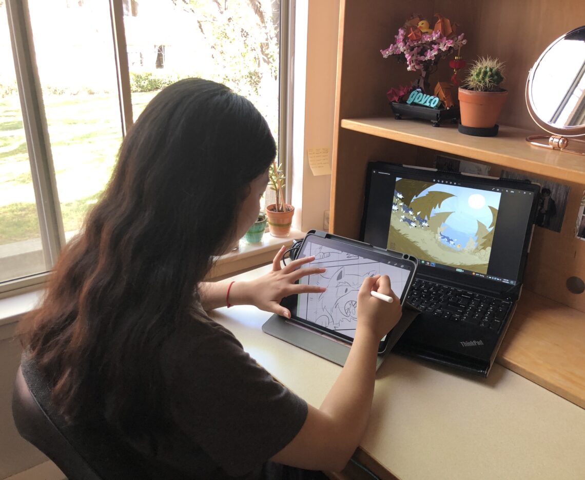 A sneak peek at Lisa’s workspace in her dorm room as she works on inking a page of her comic on her iPad.