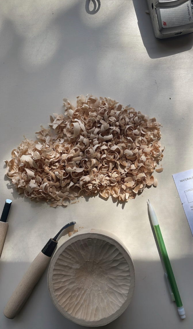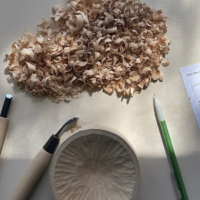 • This image depicts two wood carving tools, a pile of wood shavings, and a wood bowl carved out of pine wood.