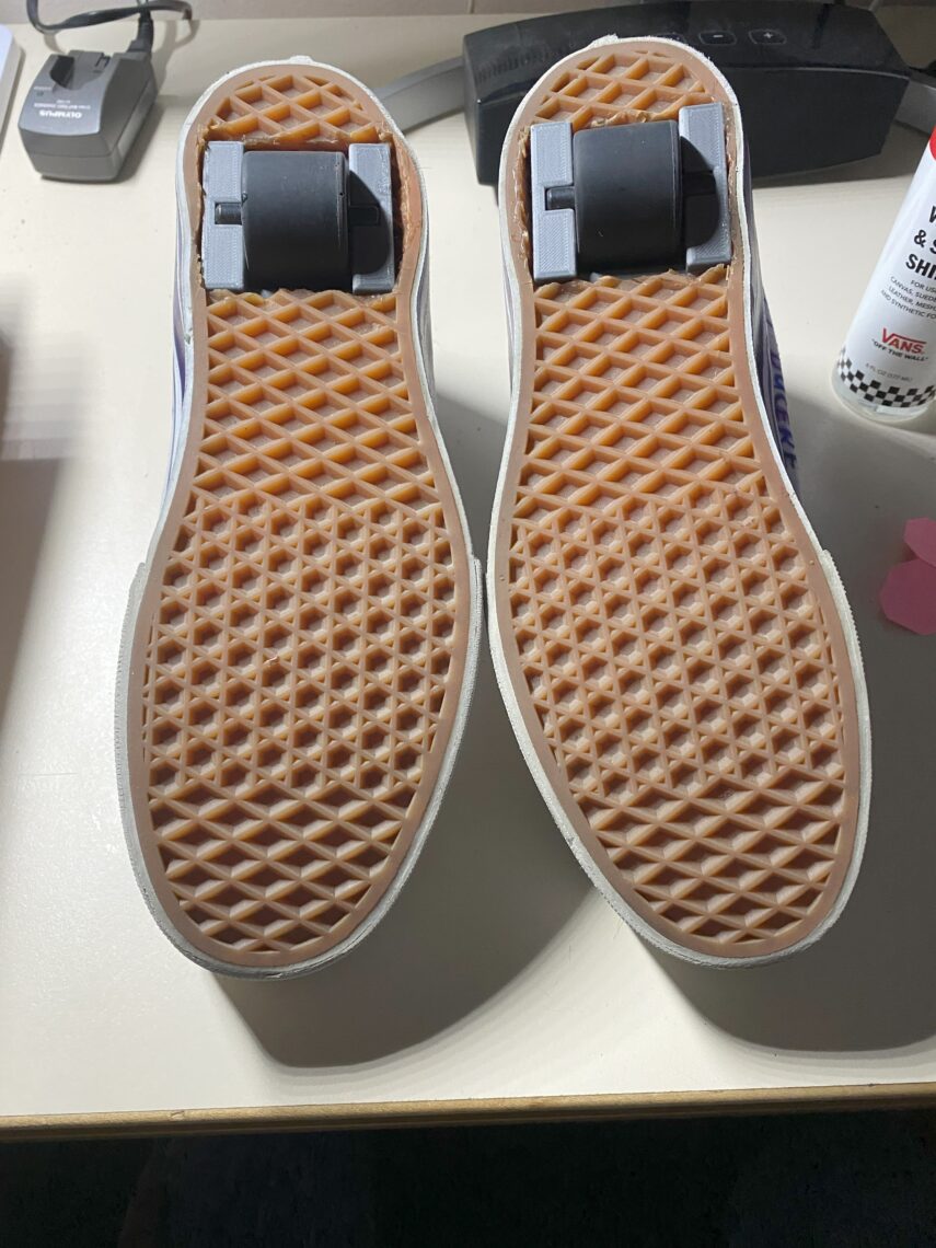 • Soles of shoes were measured and cut to fit 3D printed wheel well housings and wheels.