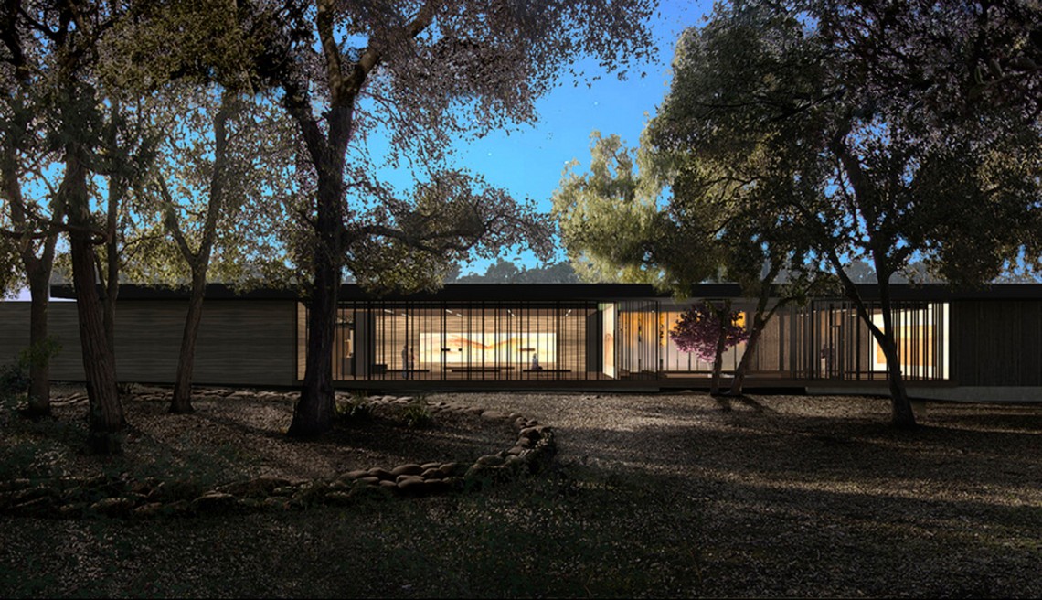 The Windhover Contemplative Center and adjacent grove as seen from the direction of the Papua New Guinea Sculpture Garden.
