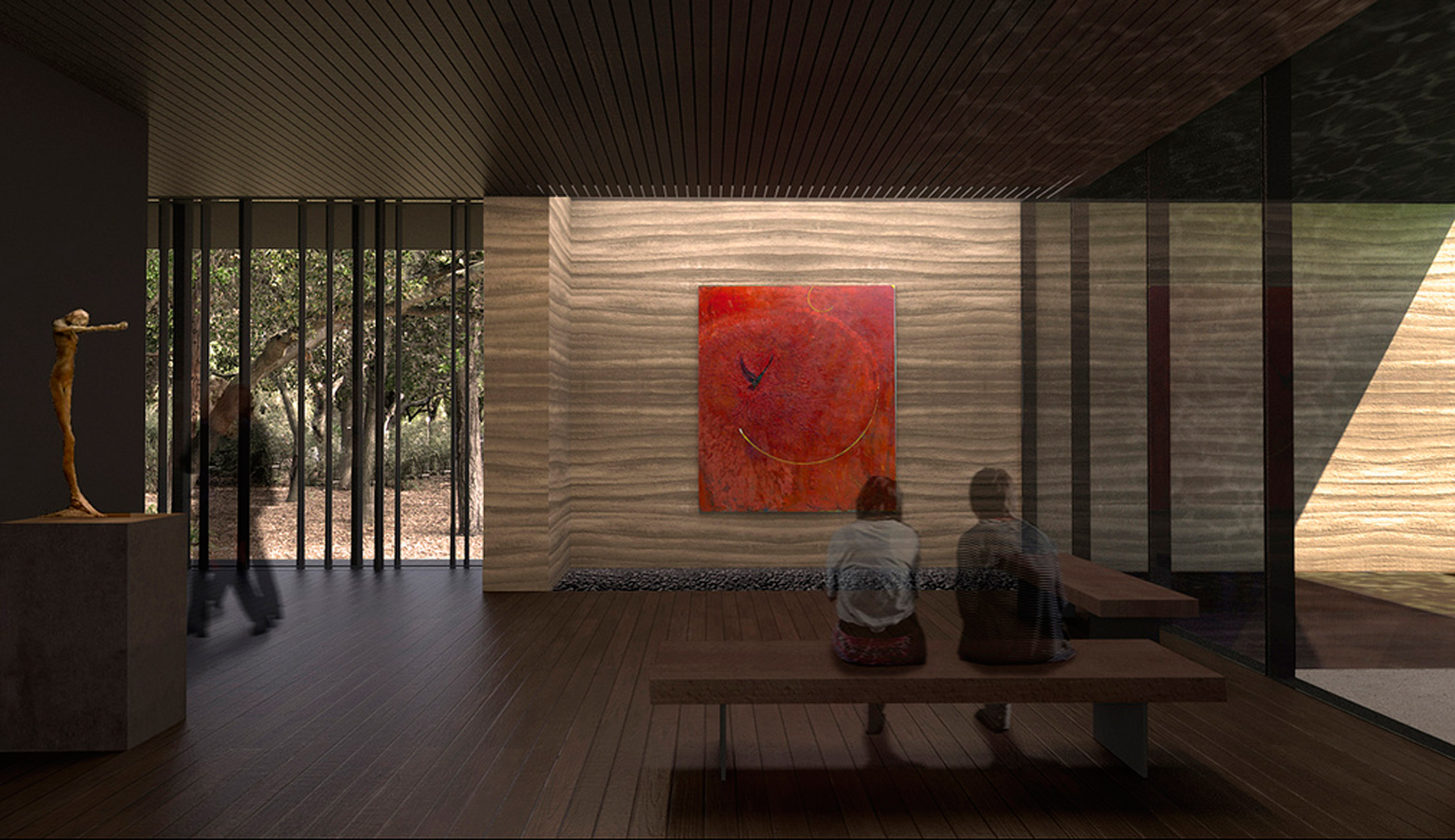 The new center, designed by Aidlin Darling Design architects, will be located on what is now a parking lot in front of Roble Hall. It will include three rooms featuring four large paintings by the late Stanford art Professor Nathan Oliveira. Outside landscaping will feature a reflection pool and garden areas for meditation. The building will be enclosed in glass, allowing for viewing of the Oliveira paintings even from outside. Benches and cushions will be strategically placed in the three main rooms to allow visitors to quietly view the paintings.